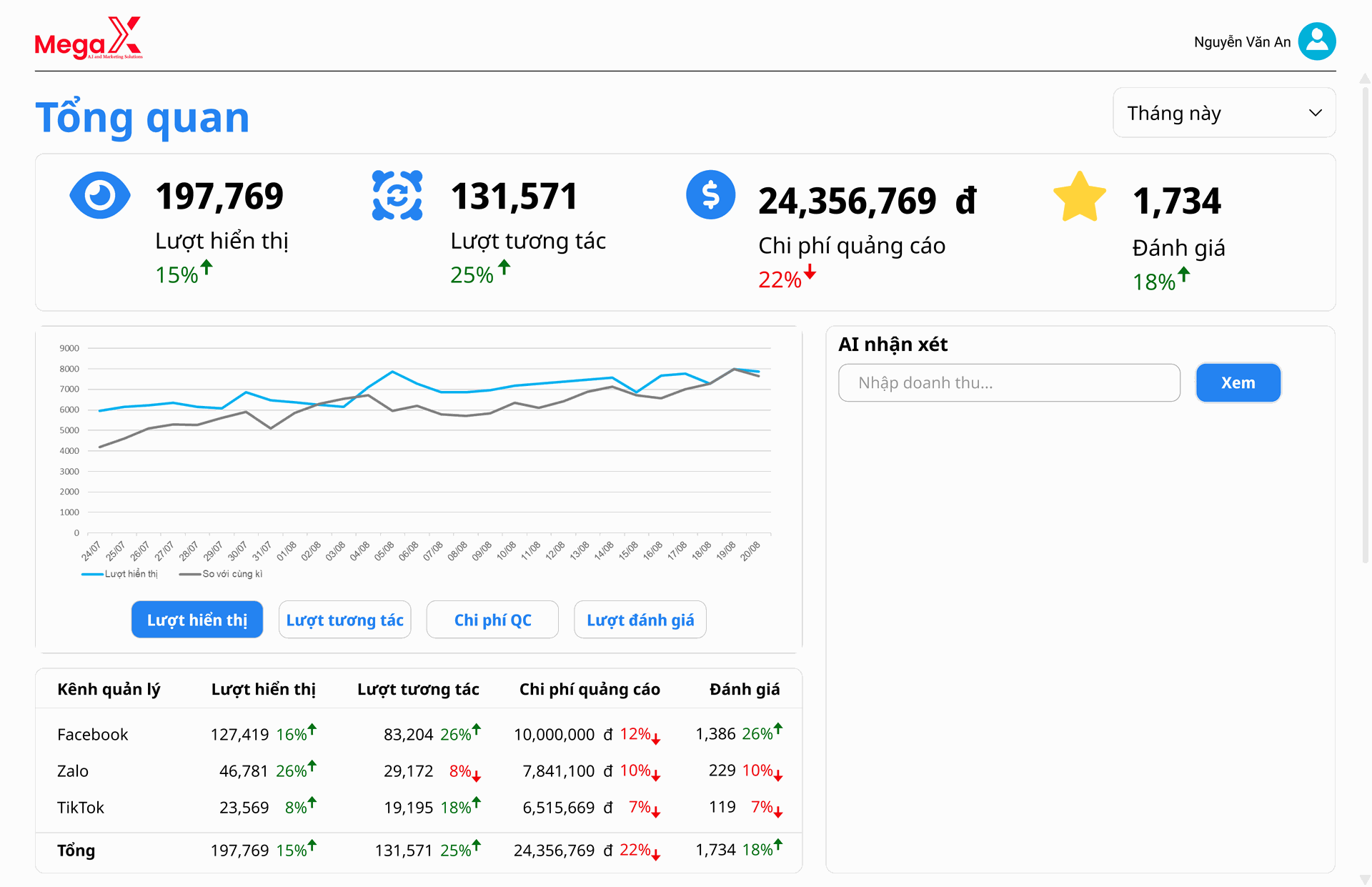 Cung cấp báo cáo tự động từ tổng quan đến chi tiết theo từng kênh, từng chiến dịch. Tích hợp AI thông minh tự động phân tích dữ liệu theo thời gian thực, Đưa ra nhận xét, cảnh báo, gợi ý tối ưu hiệu suất